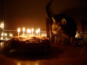 The Verdict:  Delicious!  Decadent!  Delightful!  I was extremely pleased with my birthday cake, my husband loved it, and my cat was intrigued…a success all around!