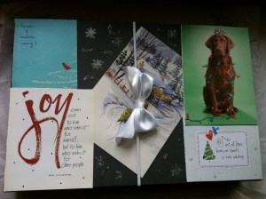 Use a gift box as a palette for all those cute/beautiful holiday cards you receive! Fronts of cards cut to size if necessary and glued to box. Bare area decorated with silver pen. Box kept closed with elastic band with bow.