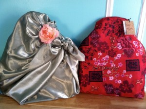 Fabric option easily solves how to wrap oddly shaped gifts like bags. Left: Fabric tied into place in several spots. Right: Fabric folded over in back and edges glued into place (carefully!).